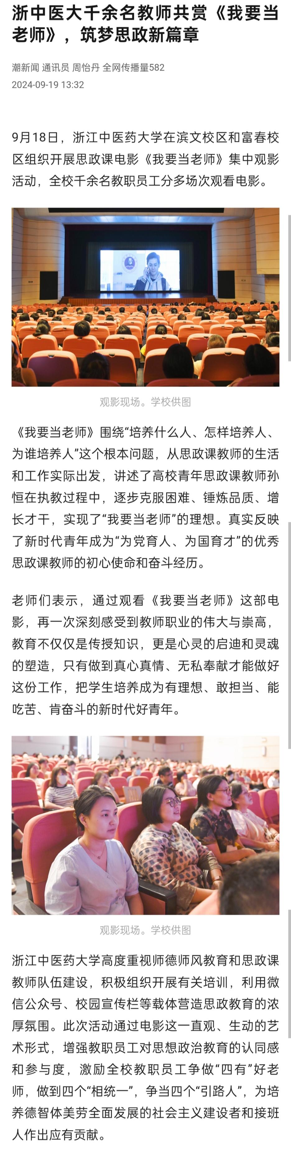 潮新闻:浙中医大千余名教师共赏《我要当老师》,筑梦思政新篇章