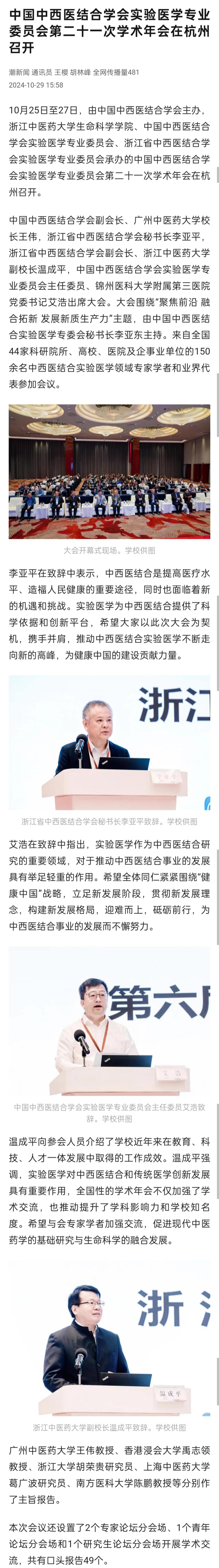 潮新闻:中国中西医结合学会实验医学专业委员会第二十一次学术年会在杭州召开