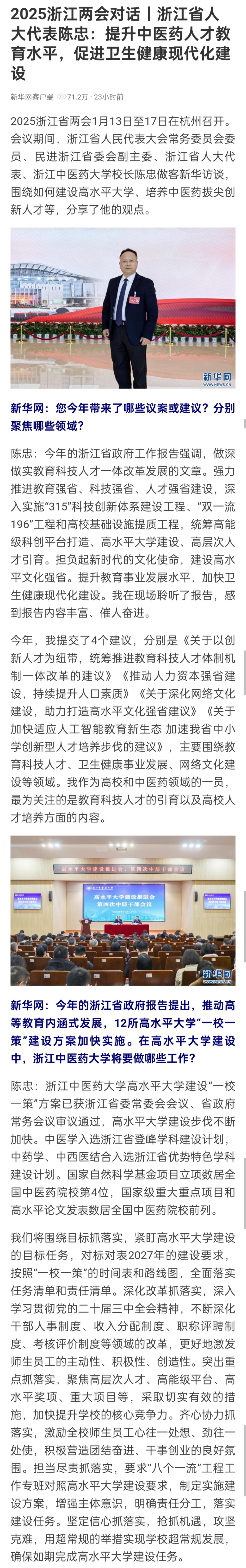 2025浙江省两会1月13日至17日在杭州召开。会议期间,浙江省人民代表大会常务委员会委员、民进浙江省委会副主委、浙江省人大代表、久久精品一区二区三区四区校长陈忠做客新华访谈,围绕如何建设高水平大学、培养中医药拔尖创新人才等,分享了他的观点。