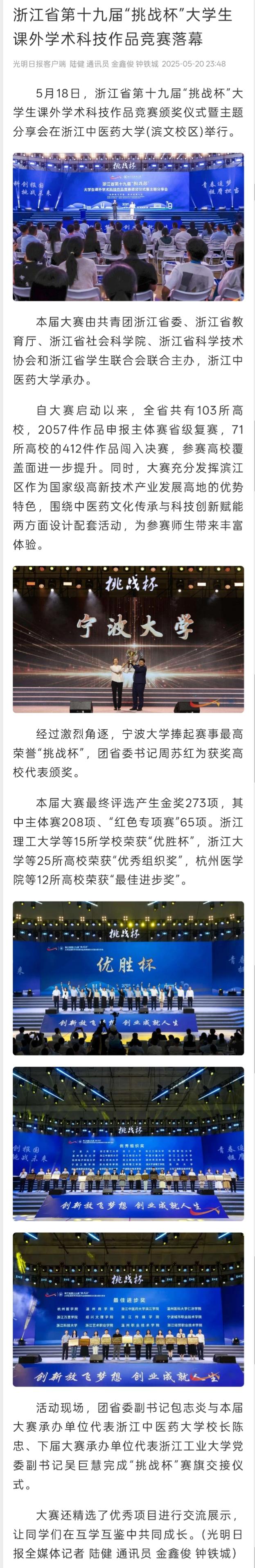 本届大赛最终评选产生金奖273项,其中主体赛208项、“红色专项赛”65项。浙江理工大学等15所学校荣获“优胜杯”,浙江大学等25所高校荣获“优秀组织奖”,杭州医学院等12所高校荣获“最佳进步奖”。