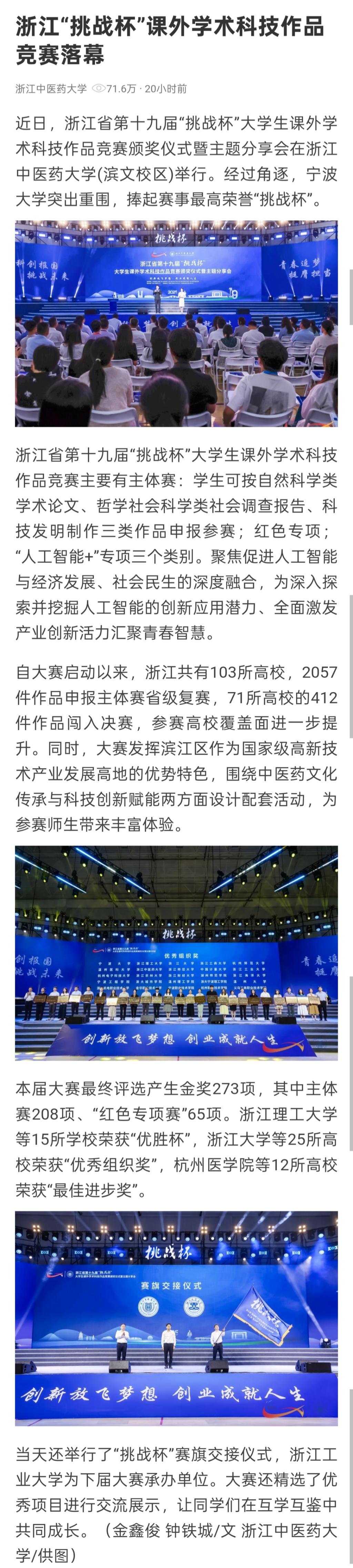 浙江“挑战杯”课外学术科技作品竞赛落幕