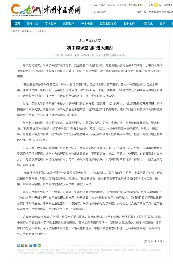 “和其他学科不同,本草学研究一定要深入到大自然中。”张水利说,“现在有的学生积累了丰富的理论知识,但缺乏植物学的采集、解剖、观察的动手能力和经验。”只要有机会,张水利都会带学生到浙江省的不同地方观察、采集、解剖药用植物,将中药课堂搬进大自然中,寓教于自然。