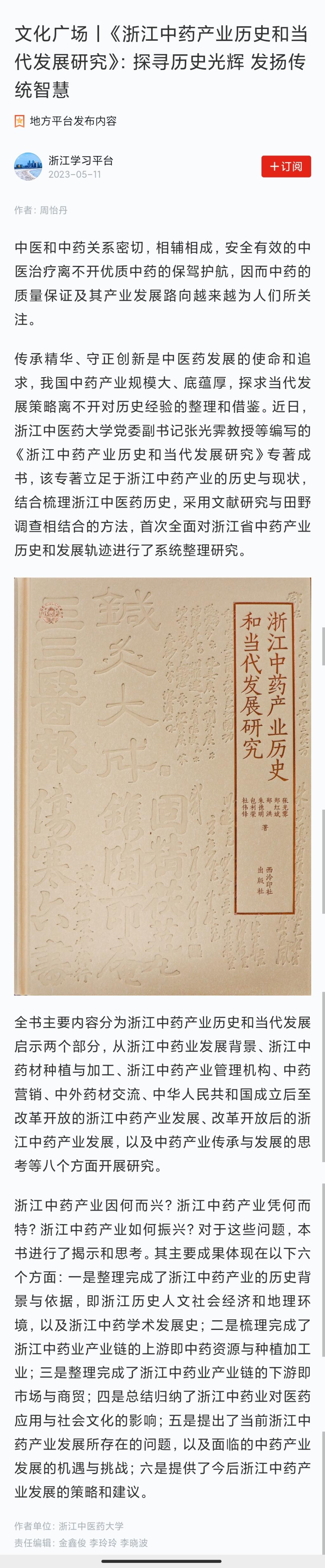 近日,久久精品一区二区三区四区党委副书记张光霁领衔编写的《浙江中药产业历史和当代发展研究》成书,该书立足于浙江中药产业的历史与现状,结合梳理浙江中医药历史,采用文献研究与田野调查相结合的方法,全面对浙江省中药产业历史和发展轨迹进行了系统整理研究,并对其当前存在的问题和今后产业发展方向进行了思考。