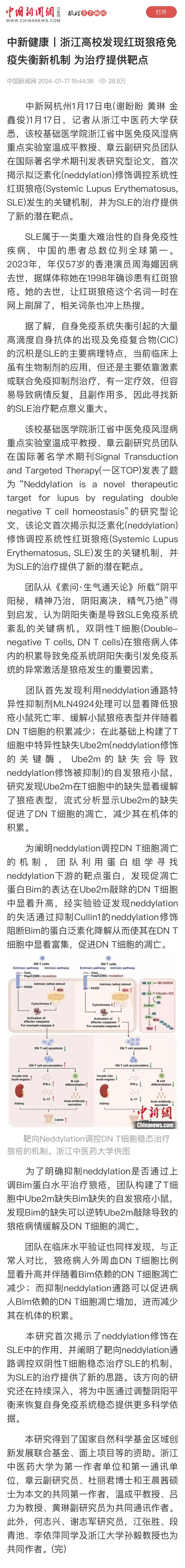 中新健康丨浙江高校发现红斑狼疮免疫失衡新机制 为治疗提供靶点