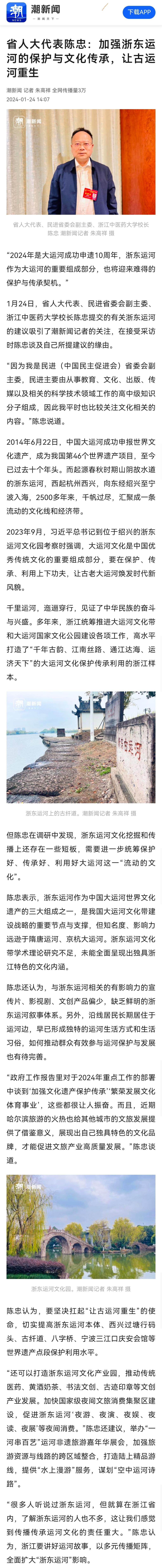 1月24日,省人大代表、民进省委会副主委、久久精品一区二区三区四区校长陈忠提交的有关浙东运河的建议吸引了潮新闻记者的关注,在接受采访时陈忠谈及自己所提建议的缘由。