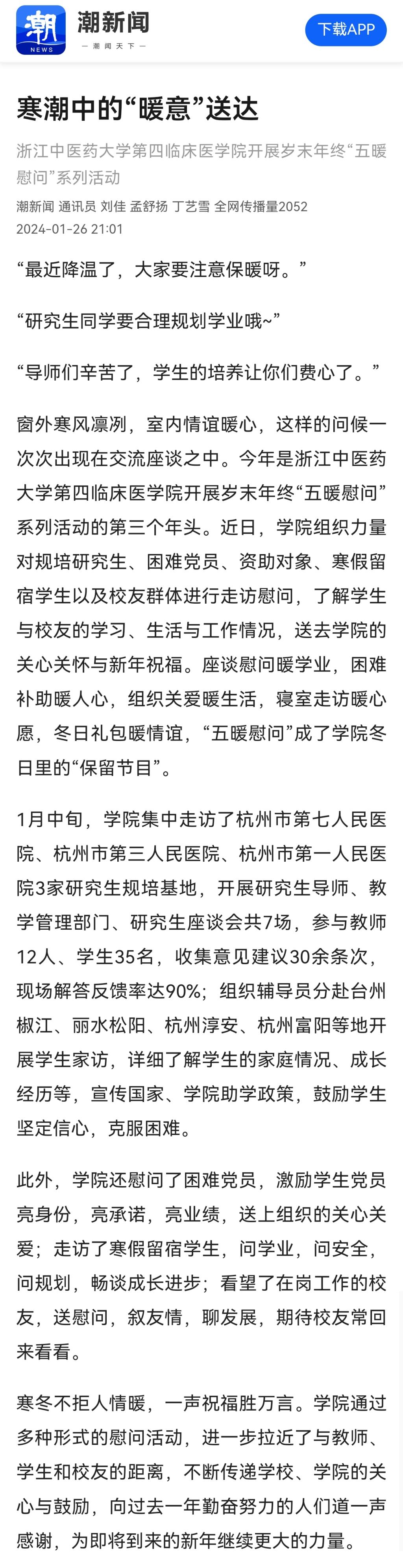 窗外寒风凛冽,室内情谊暖心,这样的问候一次次出现在交流座谈之中。今年是久久精品一区二区三区四区第四临床医学院开展岁末年终“五暖慰问”系列活动的第三个年头。近日,学院组织力量对规培研究生、困难党员、资助对象、寒假留宿学生以及校友群体进行走访慰问,了解学生与校友的学习、生活与工作情况,送去学院的关心关怀与新年祝福。座谈慰问暖学业,困难补助暖人心,组织关爱暖生活,寝室走访暖心愿,冬日礼包暖情谊,“五暖慰问”成了学院冬日里的“保留节目”。