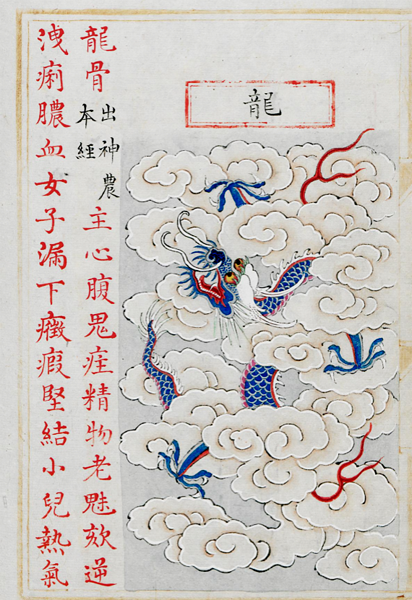 首先要说的,自然是传说中“龙”的身体遗存物,即龙骨和龙齿。它们实际是远古哺乳类大型动物的骨或齿的化石,只是古人以为是“龙”的遗骸,并因此认为它们具有“龙”的性能。