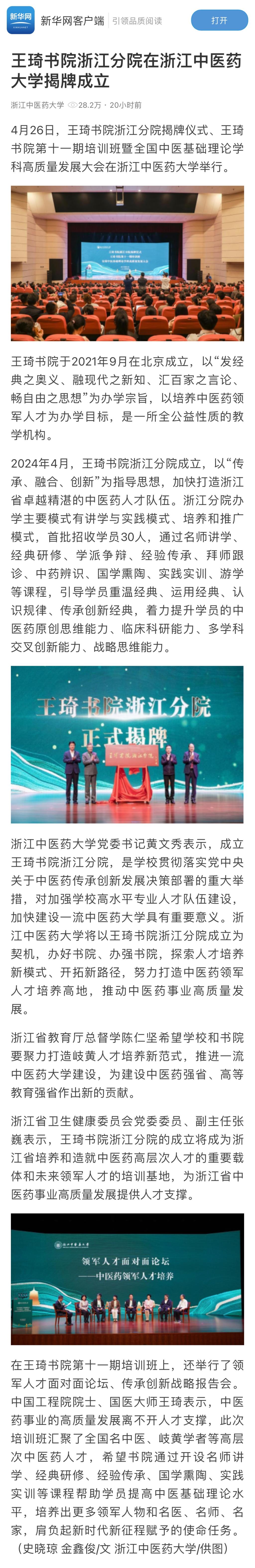 2024年4月,王琦书院浙江分院成立,以“传承、融合、创新”为指导思想,加快打造浙江省卓越精湛的中医药人才队伍。浙江分院办学主要模式有讲学与实践模式、培养和推广模式,首批招收学员30人,通过名师讲学、经典研修、学派争辩、经验传承、拜师跟诊、中药辨识、国学熏陶、实践实训、游学等课程,引导学员重温经典、运用经典、认识规律、传承创新经典,着力提升学员的中医药原创思维能力、临床科研能力、多学科交叉创新能力、战略思维能力。