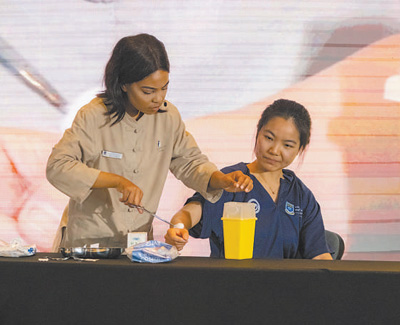 在2023年举行的第二十二届“汉语桥”世界大学生中文比赛南非赛区决赛中,来自西开普大学中医孔子学院的学生希诺(左)展示针灸治疗。