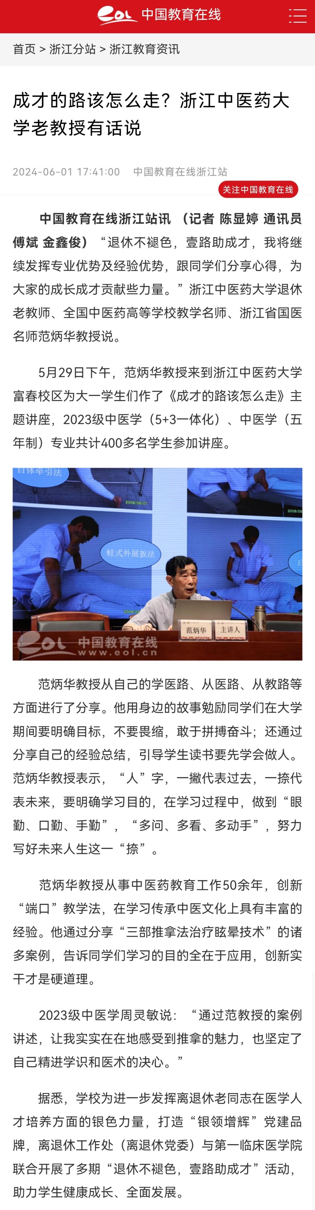 “退休不褪色,壹路助成才,我将继续发挥专业优势及经验优势,跟同学们分享心得,为大家的成长成才贡献些力量。”久久精品一区二区三区四区退休老教师、全国中医药高等学校教学名师、浙江省国医名师范炳华教授说。